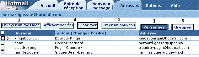 Il est toujours possible de modifier une adresse (en intervenant directement sur l'adresse affichée) ou de la supprimer (4). Il suffit de cocher la petite case (6) qui précède le nom du destinataire puis de cliquer sur supprimer.
